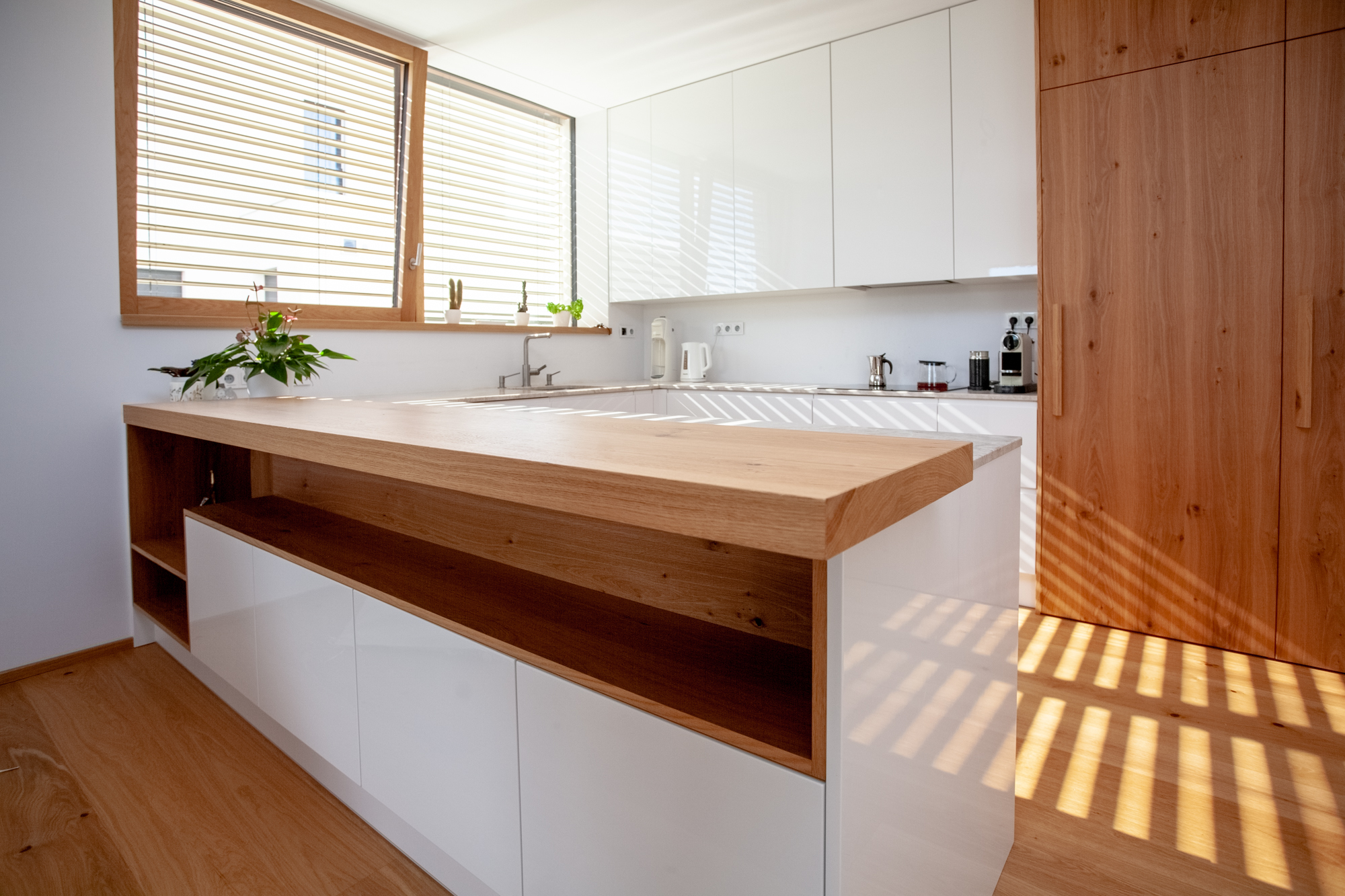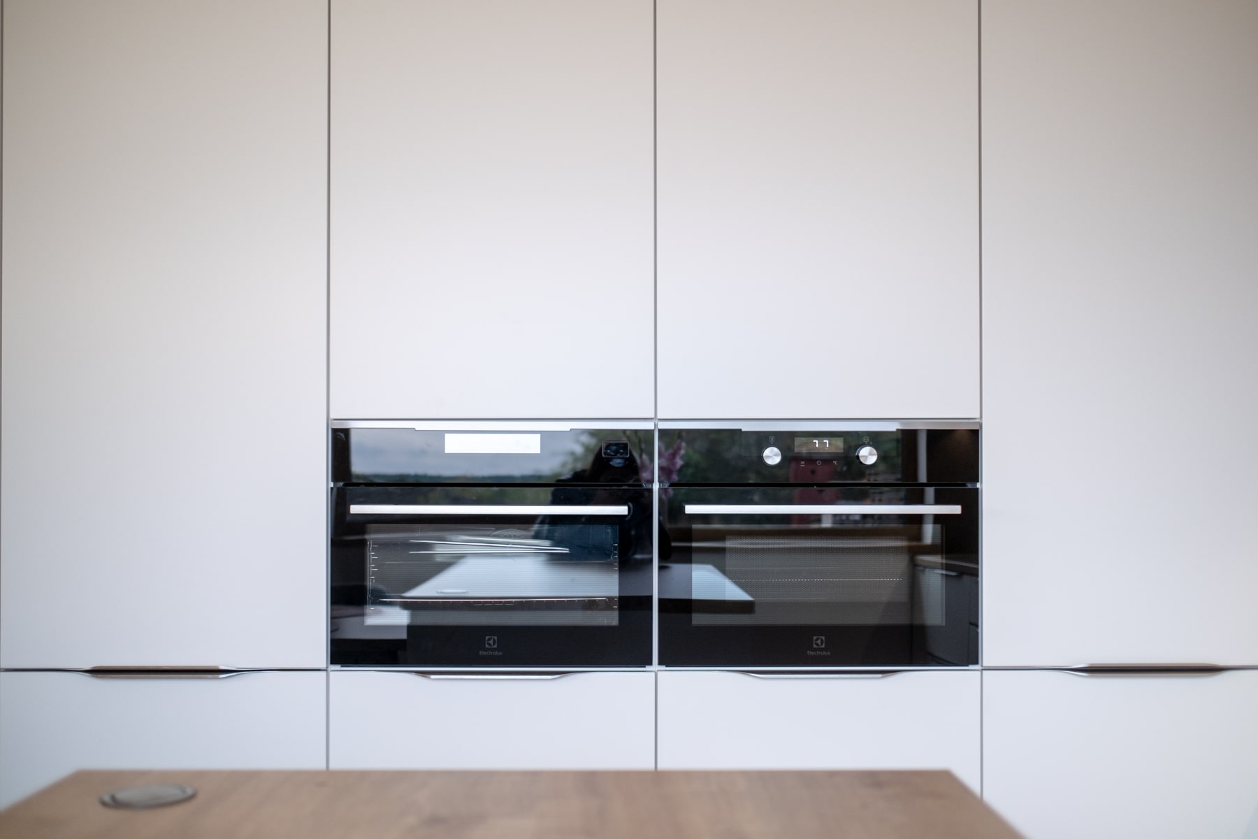 Co tuto kuchyni opravdu vyzdvihuje nad ostatními, je její vstup do spíže a skrytá lednice. Vstup do spíže je elegantně skrytý za vestavěnými dveřmi, které tvoří součást designu kuchyně. Tímto způsobem můžete mít vše co potřebujete na dosah ruky, a zároveň šikovně ukryté před zraky návštěv. Stejně tak lednice je elegantně integrovaná do vestavěné skříně. Celá tato část je vytvořena z přírodní dubové dýhy s jemným matným lakem, čímž krásně vystupuje z bílé kuchyně, ale zároveň působí jako jeden celek díky tomu, že stejná dýha je použita i na barovou desku.